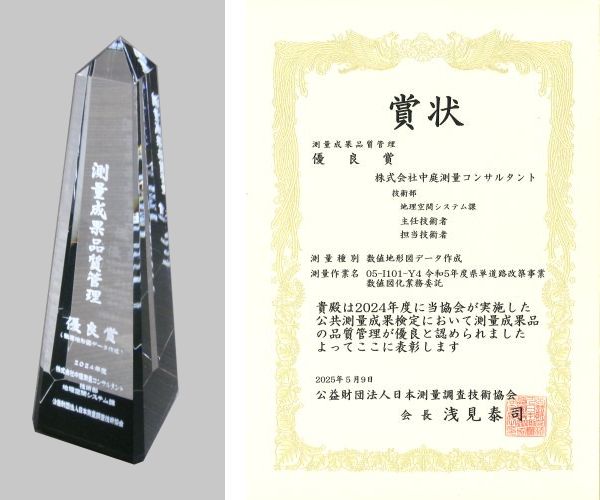 公益財団法人日本測量調査技術協会より、2024年度「測量成果品質管理」優良表彰を受賞しました。